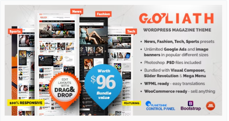 Goliath is fully Responsive WordPress News & Reviews Magazine theme that looks and works great on mobile devices, tablets and computers. Goliath is especially well suited for creating product reviews – it has built-in rating system, cool summary tools and improved review display in Google search results. With Goliath it’s easier than ever to set up your advertising – the theme includes ads system that allows you to insert Google Adsense, Iframe or regular image banners. Goliath comes with lots of extra features, including two industry leading plugins – Visual Composer and Revolution Slider as well as our custom built Mega Menu. Combined, you’re getting more than $90 of extra value!