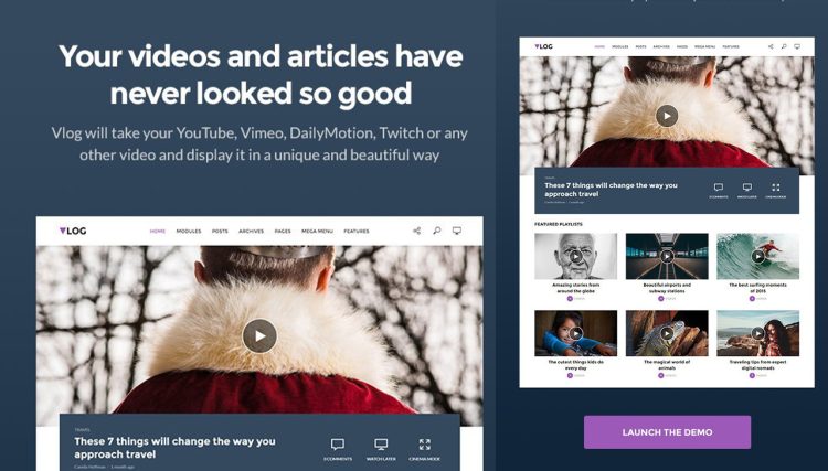 Vlog is a beautifully crafted WordPress videos theme with a strong focus on videography. It also perfectly complements the needs of complex video magazine and video news websites with sophisticated layouts and dynamic ways to present your videos (YouTube, Vimeo plus many more…) and articles any way you can imagine.